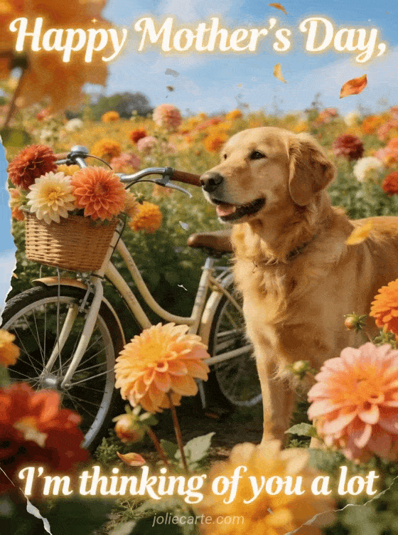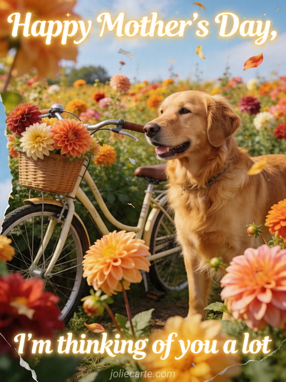 Share warm wishes Mother's Day on a sunny realistic card with a golden retriever in a dahlia meadow beside a vintage bicycle basket. Discover also a picture for Mother's Day, sweet words for Mother's Day, or a drawing for Mother's Day.