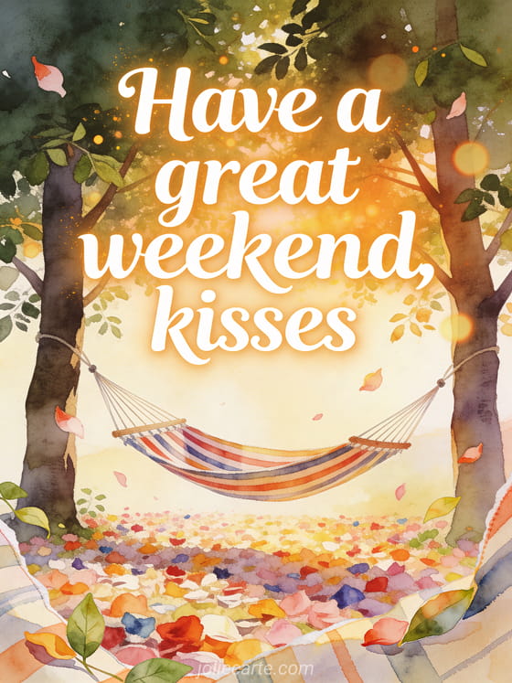 Share a soft weekend greeting full of affection with a watercolor hammock, leafy trees and colorful petals. You can also send a good weekend kisses image, a lovely weekend animated kisses or a great weekend kisses photo to brighten the break.