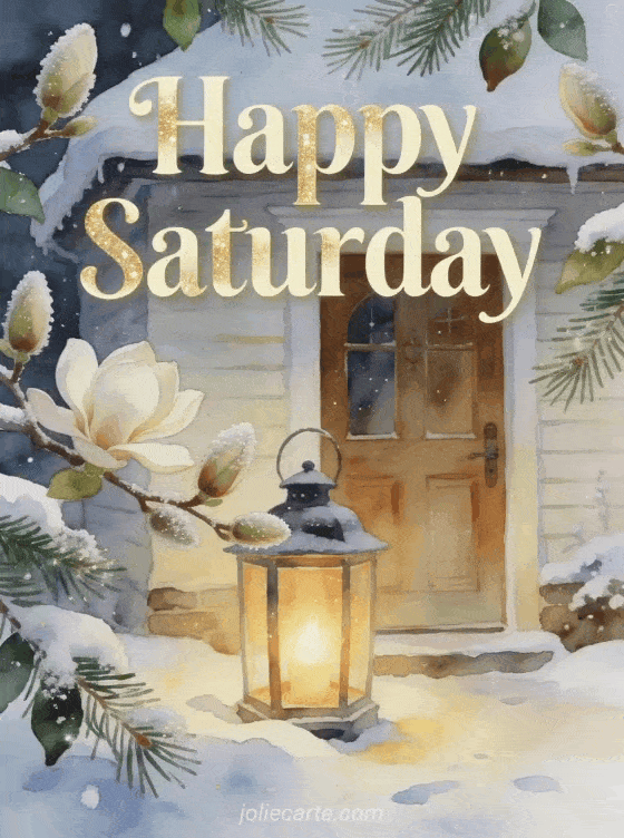 Send a warm happy Saturday greeting with a snow-covered cottage doorway, a glowing lantern and frosted magnolia buds. Discover also good morning and happy saturday gifs, happy saturday my friend image or romantic happy Saturday image.