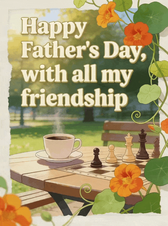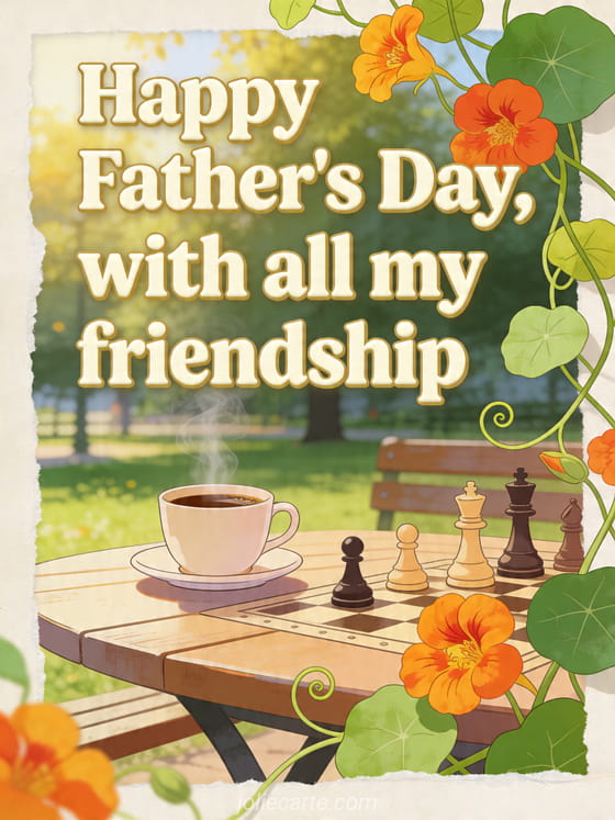 Share a friendly illustrated Father's Day card with a sunny park table, steaming coffee cup, chess pieces and vivid nasturtium vines that overlap the image border. It is a warm way to send friendship and good wishes. Discover also my love my darling happy father's day, an original Father's Day gif or best father's day.