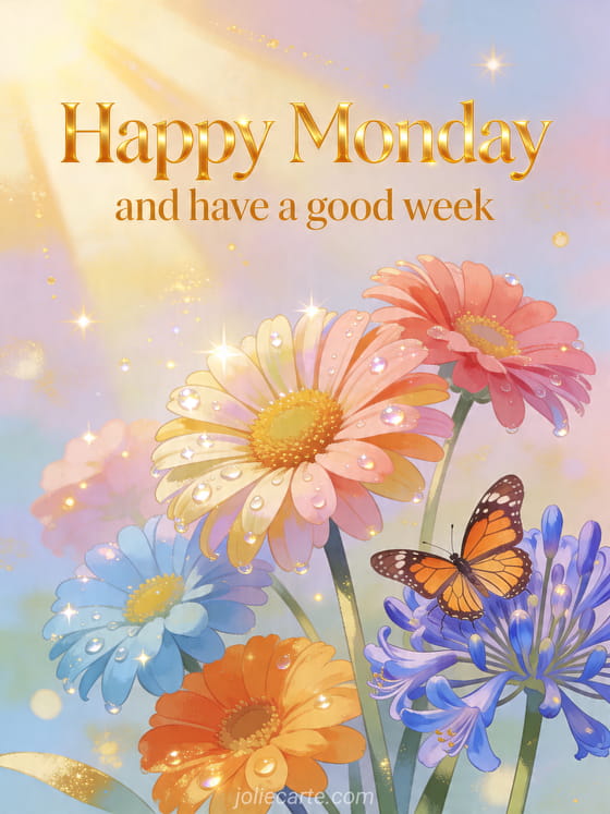 Send a bright Monday and good week message with this radiant card showing colorful gerberas, an agapanthus bloom and a monarch butterfly. You can also discover good morning happy monday good morning good week, coffee happy monday images or happy monday photo.
