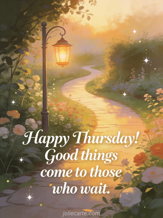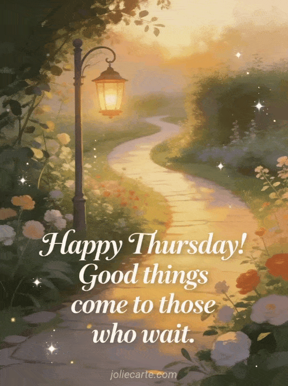 Share a thoughtful happy Thursday message with refined script, warm glow, a winding garden path, a lantern at dawn, soft golden light, and delicate sparkles. Discover also have a good day thursday, happy thursday cat, or good day Thursday card.