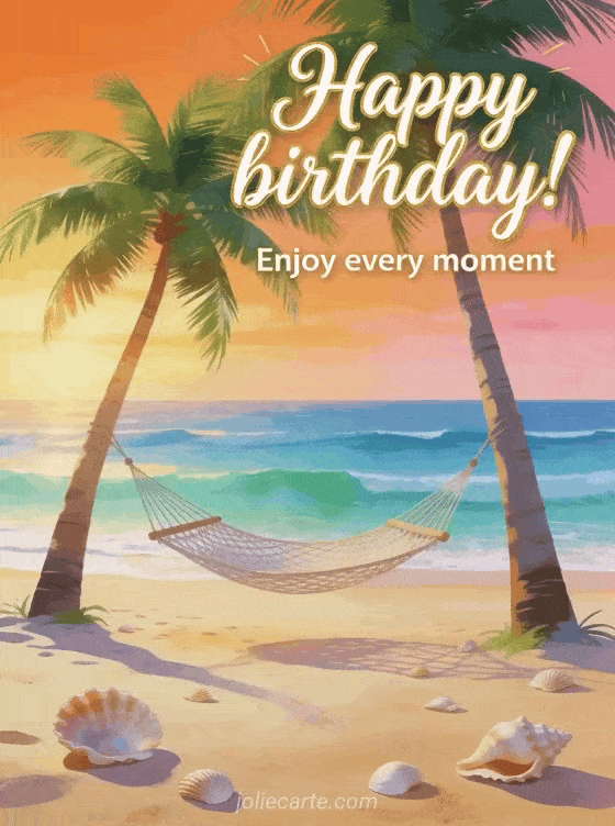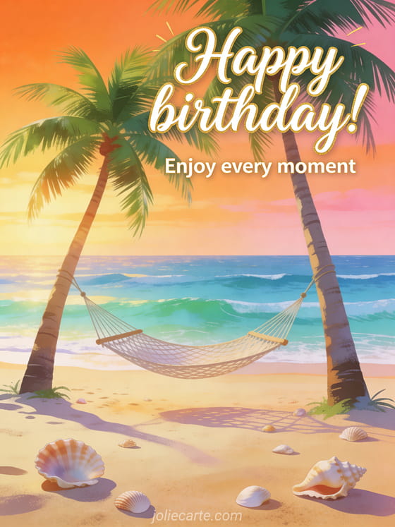 Celebrate someone's birthday with this serene greeting encouraging to enjoy every moment, featuring a beautiful tropical beach. Discover also a birthday nothing but happiness card or a birthday smile at life card or a birthday beautiful things card.
