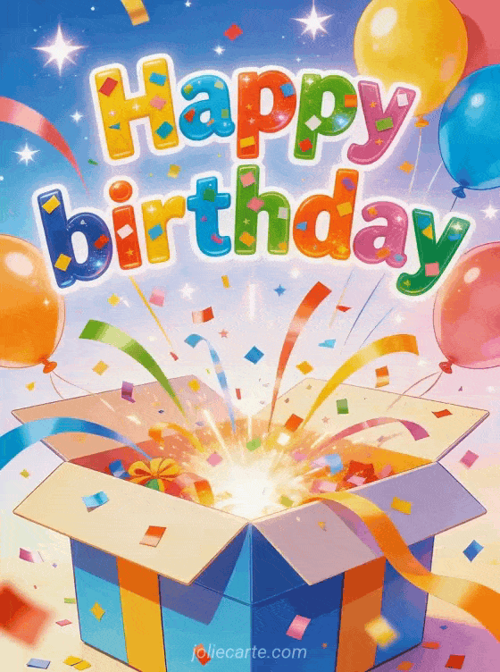 Surprise someone on their birthday with this fun card featuring a giant gift box exploding with colorful confetti and balloons flying up. Discover also a happy birthday card with roses or a happy birthday card with daffodils.