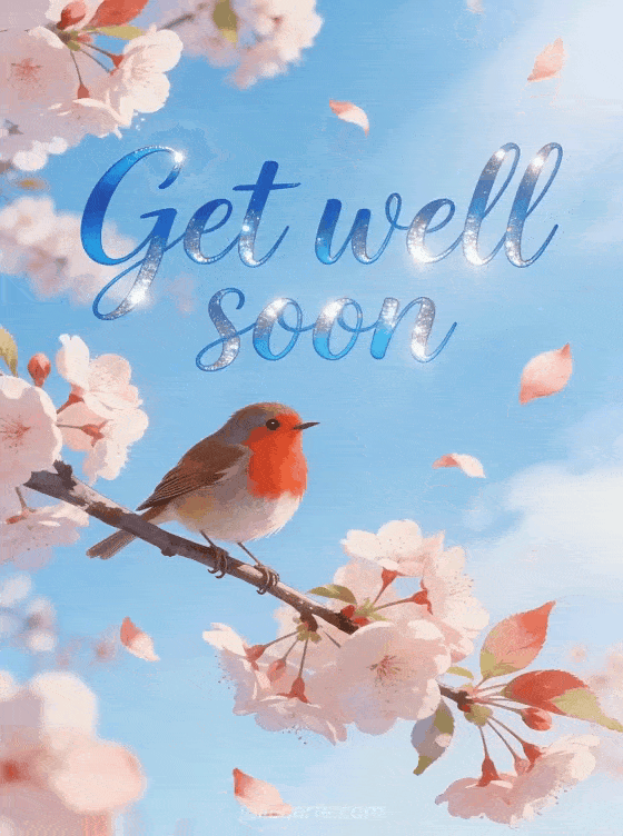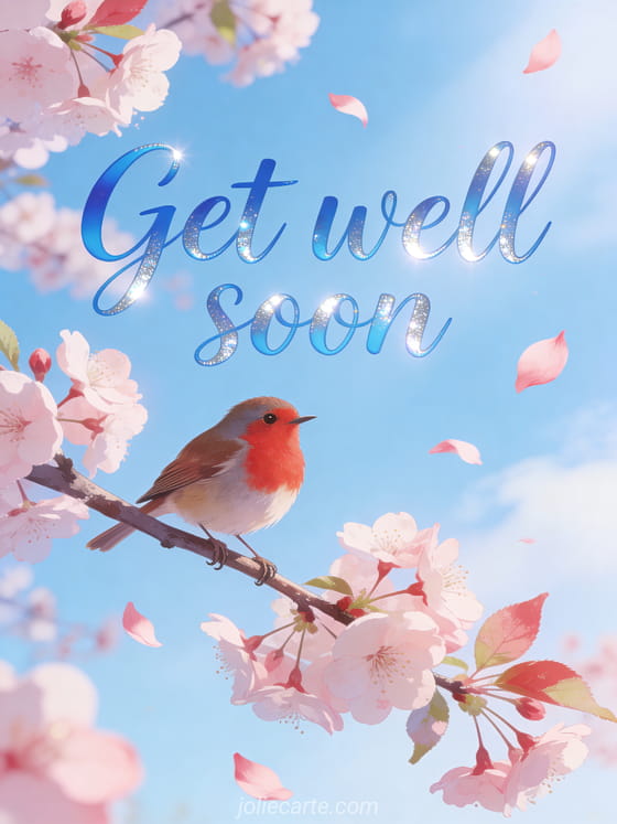 Share a heartfelt get well soon message with a robin on a blooming cherry branch and soft spring light. You can also discover get well soon text, get well soon messages, and heart courage get well soon.