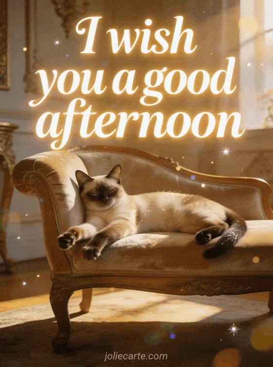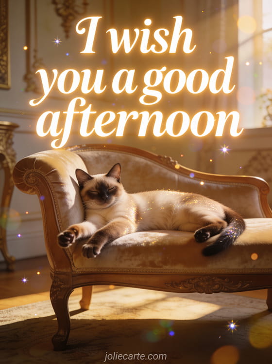 Send this elegant good afternoon wish with a sweet Siamese cat stretching luxuriously on a velvet chaise longue in warm afternoon light. Discover also a good afternoon image card or a good afternoon rain card.