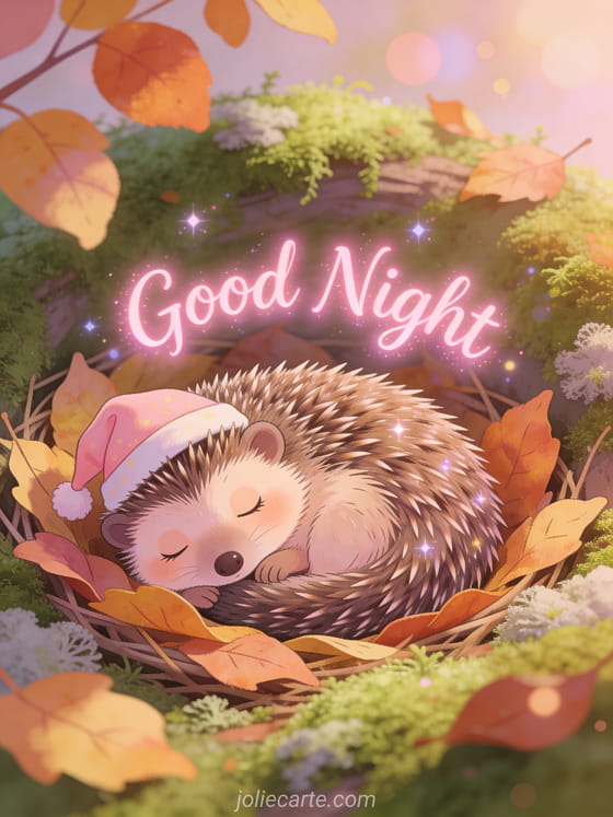 Send a sweet good night image to wish your love a peaceful night with this adorable free card. A sweet hedgehog in a tiny sleeping cap curled up in a cozy nest of autumn leaves and soft moss, for a tender goodnight. Discover also a good night love message image card or a love words to say good night card.