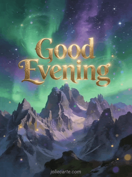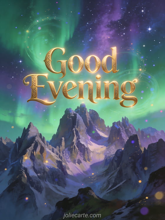 Share the wonder of the world with this breathtaking good evening card featuring aurora borealis in green, purple and blue tones over starlit mountain peaks. Discover also a pretty good evening card or a good evening humor image.