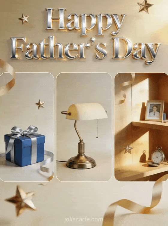 Share a warm, realistic Father's Day card with a blue gift box, classic desk lamp and sunlit wooden shelf filled with small keepsakes, ribbons and stars. This elegant design is simple, joyful and easy to send. Discover also a Father's Day baby card, Father's Day heart card or happy day dad and mom.