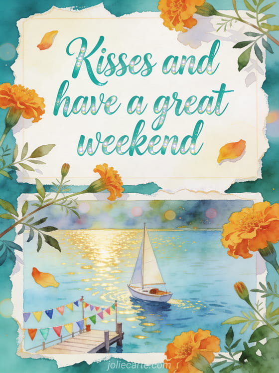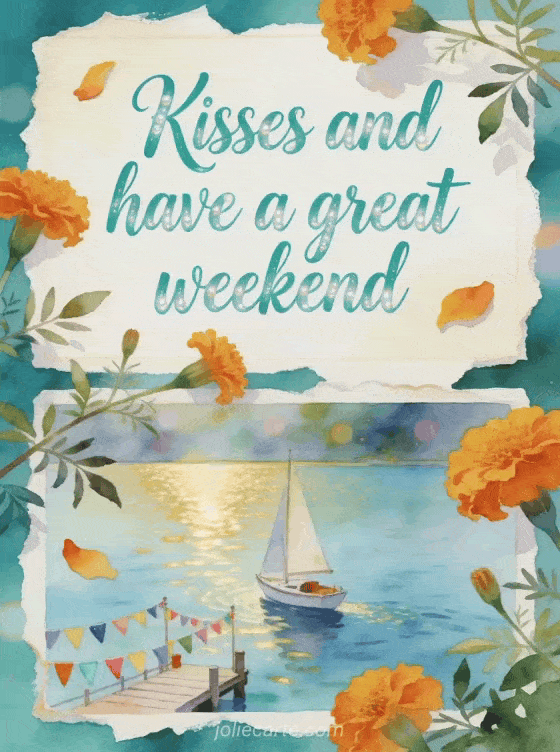 Share a cheerful weekend mood with teal calligraphy, marigold petals and a sailboat gliding across a sunny lake near festive bunting. You can also send a happy weekend kisses gif, beautiful good weekend kisses images or good weekend and lots of kisses.
