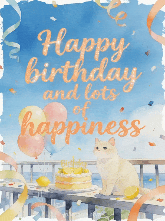 Share a fresh birthday greeting with apricot calligraphy, a cream cat, pastel balloons, a lemon birthday cake, curling ribbons, and confetti on a breezy balcony. You can also send a happy birthday mom I love you image, a birthday image for mom, or a happy birthday mom animated gif.