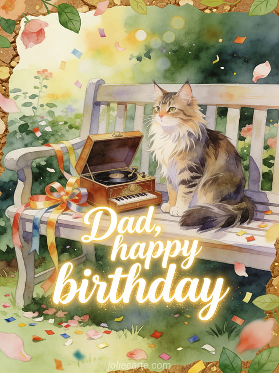 Send a gentle birthday greeting for dad from your daughter with a watercolor Maine Coon, an open music box and festive ribbons on a garden bench. You may also like happy birthday my beloved dad, happy birthday to dad or funny happy birthday dad humorous.