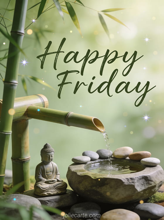 Share a peaceful happy friday greeting with mindful sage green calligraphy, a bamboo fountain, smooth river stones and a small Buddha statue in a meditation garden atmosphere. Discover also a happy friday and good weekend card, a happy friday kisses image or a happy friday card.
