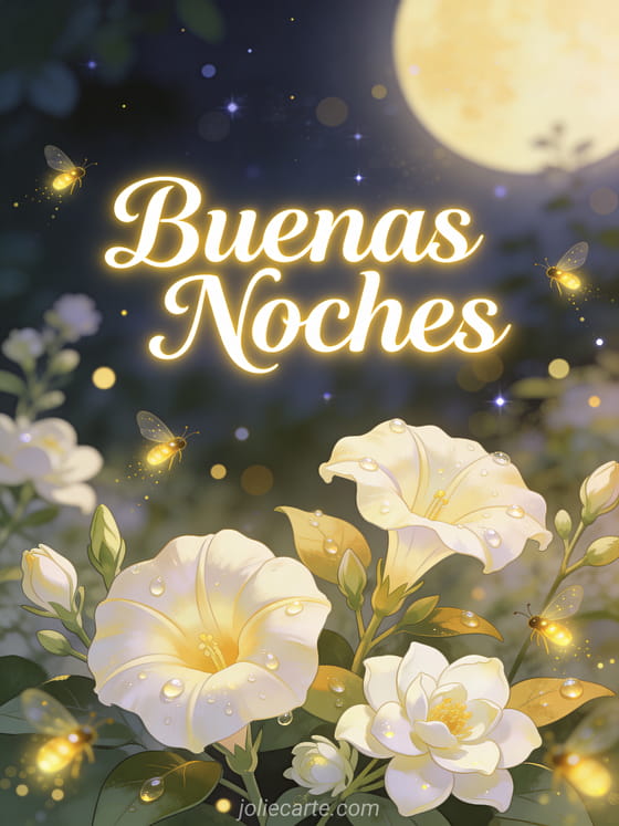 Desea dulces sueños con esta encantadora tarjeta con flores nocturnas y luciérnagas brillantes en un jardín iluminado por la luna. Descubre también una tarjeta de buenas tardes y buenas noches o una tarjeta de buenas noches dulces sueños.