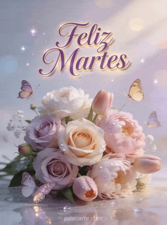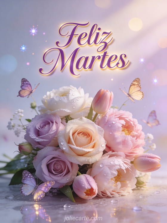 Alegra el martes de alguien con esta elegante tarjeta Feliz Martes con un precioso arreglo de rosas, peonías y tulipanes en colores pastel con rocío y delicadas mariposas. Descubre también una tarjeta Feliz Martes divertida, una tarjeta Feliz Martes cachorro o una tarjeta Feliz Martes pájaros.