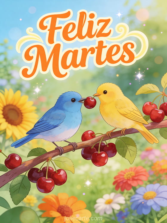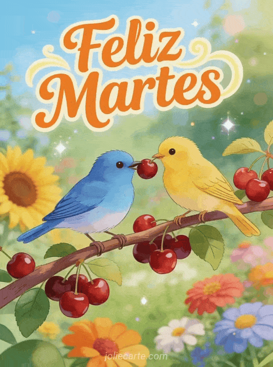 Alegra el martes de alguien con esta animada tarjeta Feliz Martes con un azulejo y un jilguero compartiendo cerezas en un colorido jardín de verano con girasoles y zinnias.
