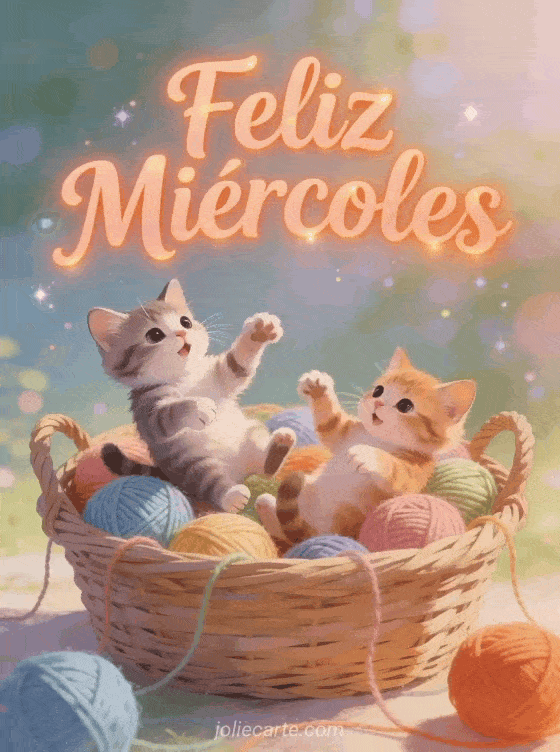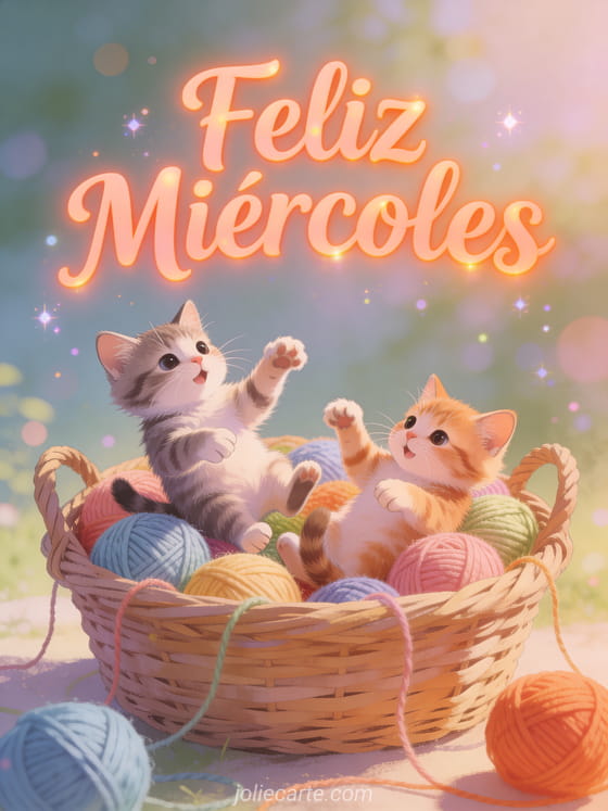Alegra el miércoles de alguien con esta adorable tarjeta Feliz Miércoles con dos gatitos juguetones revolcándose en una cesta de ovillos de lana coloridos en una alegre atmósfera pastel.