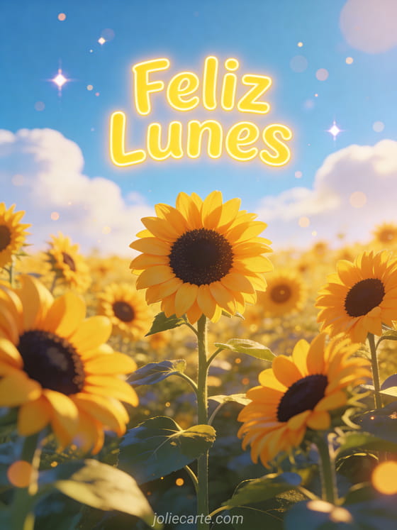 Alegra el lunes de alguien con esta tarjeta Feliz Lunes con un campo de girasoles bajo un cielo azul con nubes esponjosas. Descubre también una tarjeta inicio de semana, una tarjeta lunes gif o una tarjeta feliz lunes.