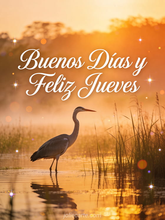 Empieza tu jueves con serenidad enviando esta elegante tarjeta Buenos Días y Feliz Jueves con una garza en aguas poco profundas entre juncos al amanecer. Descubre también una tarjeta Feliz Jueves Soleado.