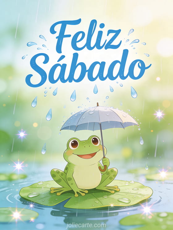 Envía un gracioso saludo de feliz sábado con esta divertida tarjeta. Una rana alegre con un pequeño paraguas sobre una hoja de nenúfar durante un cómico día de lluvia, trayendo alegría para empezar el fin de semana.