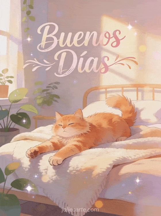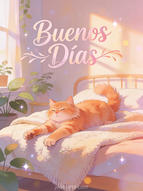 Empieza la mañana de alguien con calidez con esta adorable tarjeta de buenos días. Un esponjoso gato naranja se estira perezosamente sobre una manta acogedora, con cálida luz matutina creando suaves sombras en un dormitorio tranquilo. Descubre también una tarjeta de buenos días graciosa.