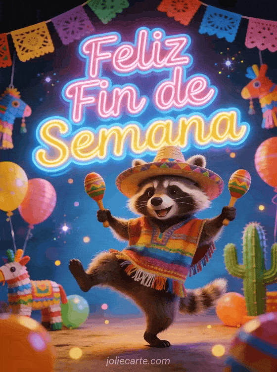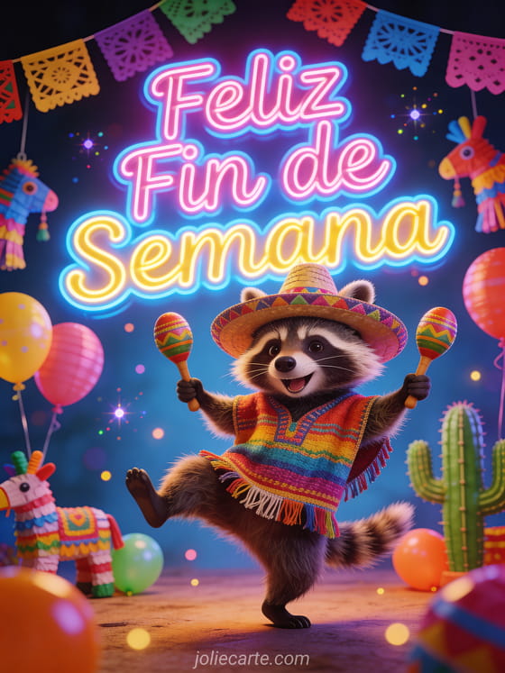 Envía un divertido saludo de feliz fin de semana para empezar con una sonrisa. Un gracioso mapache baila con maracas rodeado de coloridas decoraciones de fiesta y papel picado. Descubre también una tarjeta de fin de semana con jardín o una tarjeta divertida de fin de semana.