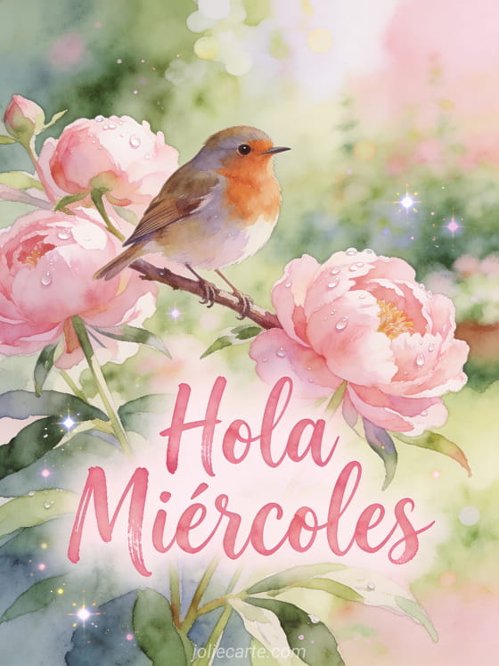 Empieza tu miércoles con serenidad enviando esta poética tarjeta Hola Miércoles con un petirrojo sobre peonías rosas florecientes con rocío matutino. Descubre también una tarjeta Feliz Miércoles gatitos.
