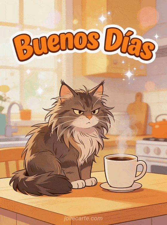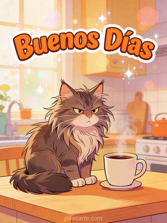 Envía un divertido buenos días para alegrar el día de alguien con humor y un gato gruñón. Descubre también una imagen gratis de buenos días, una tarjeta mensaje de buenos días para ella o una tarjeta mensaje de buenos días.