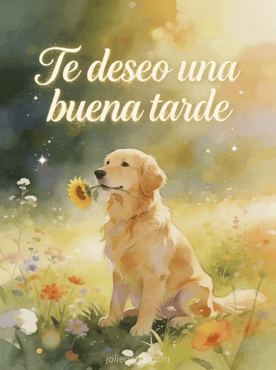 Envía un hermoso saludo de buenas tardes para alegrar el día de alguien. Un encantador golden retriever sentado en una pradera soleada con flores silvestres, sosteniendo un girasol en su boca en esta ilustración estilo acuarela.