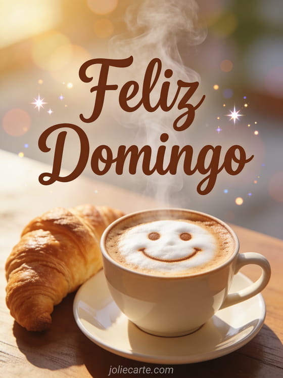 Envía un cálido saludo de feliz domingo con esta encantadora tarjeta. Un capuchino perfecto con arte latte sonriente y un croissant fresco al lado, bañados por la luz de la mañana. Descubre también una tarjeta de domingo con gatitos o una tarjeta de domingo con besos.