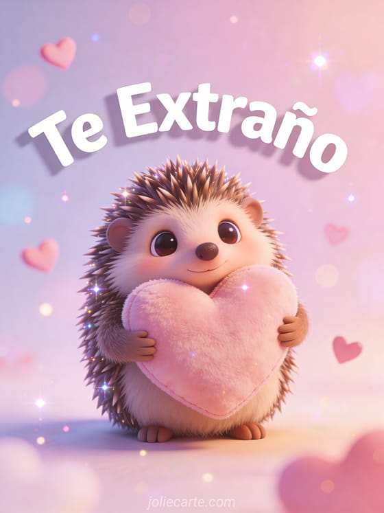 Envía esta adorable tarjeta con un lindo erizo 3D abrazando una almohada de corazón con grandes ojos emotivos sobre un fondo pastel suave. Descubre también una tarjeta te extraño humor o una tarjeta te extraño tanto mi amor.