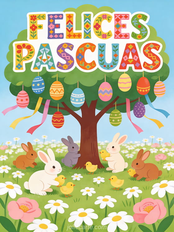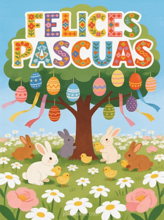Felices Pascuas una colorida felicitación pascual estilo arte popular