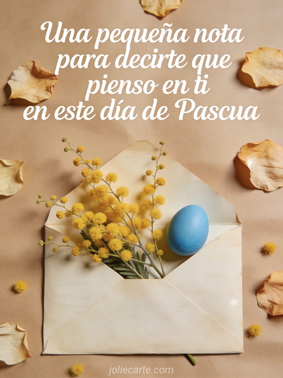 Envia este delicado saludo de Pascua para que alguien sepa que esta en tus pensamientos. Una ilustracion nostalgica con mimosa y un sobre antiguo. Descubre tambien una tarjeta de deseos de Pascua o un mensaje ilustrado de Pascua.