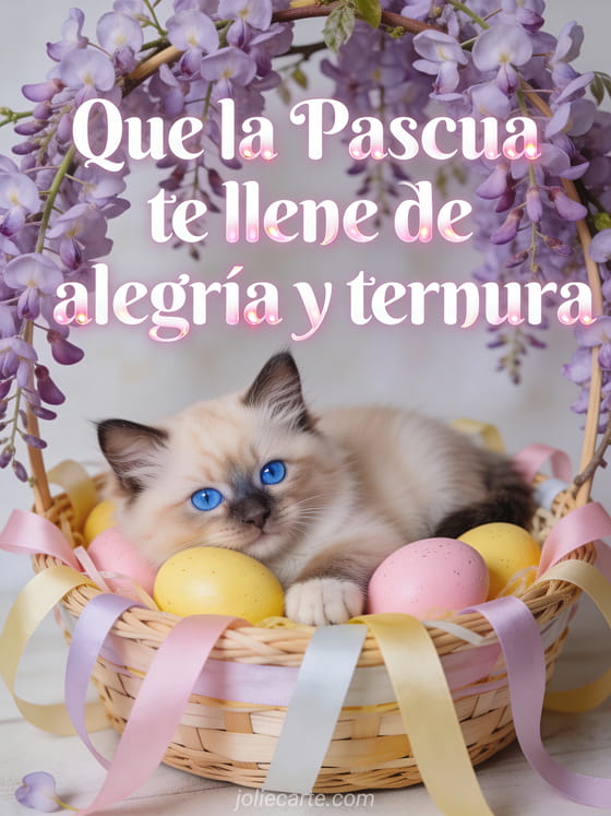 Comparte este dulce saludo de Pascua con un gato ragdoll rodeado de glicinas y huevos pintados. Una ilustracion fotorrealista llena de ternura. Descubre tambien una tarjeta de Pascua pensando en ti o una tarjeta con paloma de Pascua.