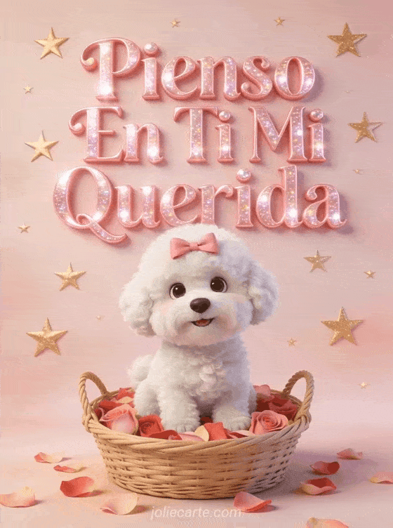 Envía esta adorable tarjeta con un lindo perrito bichón frisé blanco con un moño rosa en una canasta de pétalos de rosa. Descubre también una tarjeta pienso en ti mi amor o una tarjeta corazón pienso en ti.