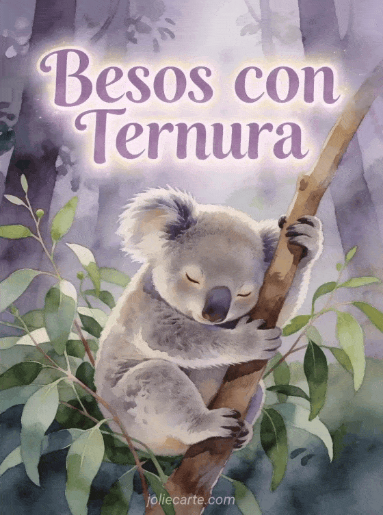 Envía un dulce saludo de besos con ternura a alguien querido con esta tranquila tarjeta. Un adorable koala se aferra a una rama de eucalipto con una expresión soñolienta y tierna, rodeado de hojas verdes bajo una luz suave filtrada. Descubre también una tarjeta de besos con gato o una tarjeta de super besos.