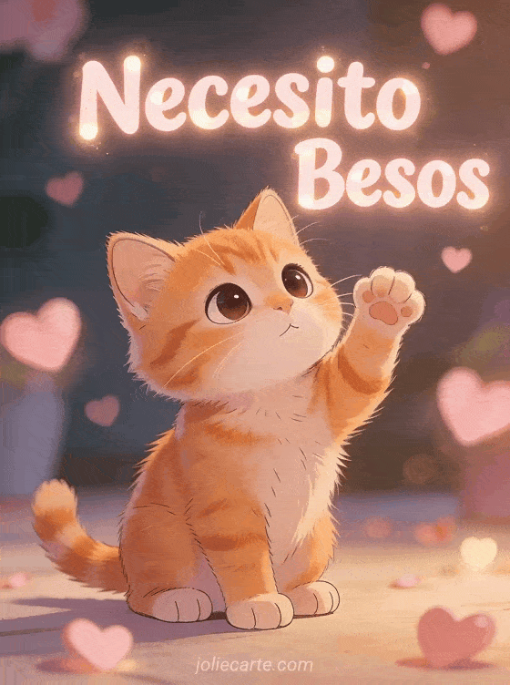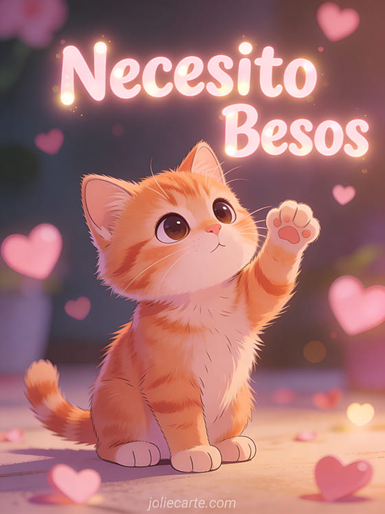 Envía un tierno saludo de necesito besos a alguien que quieres con esta adorable tarjeta. Un lindo gatito pelirrojo de grandes ojos tiernos levanta su patita pidiendo un abrazo, con corazones rosas en bokeh de fondo. Descubre también una tarjeta de besos con gatos o una tarjeta de abrazos y besos.