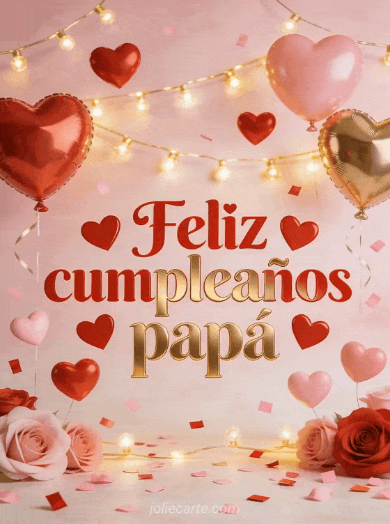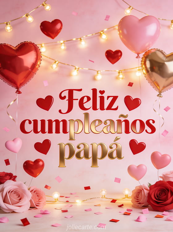 Celebra el cumpleaños de tu papá con esta hermosa tarjeta gratuita. Letras rojas y doradas con corazones, globos en forma de corazón, guirnaldas luminosas doradas y confeti. Descubre también una tarjeta de cumpleaños papá divertida o una tarjeta de feliz cumpleaños papá con texto o una tarjeta de cumpleaños papá con dibujo.