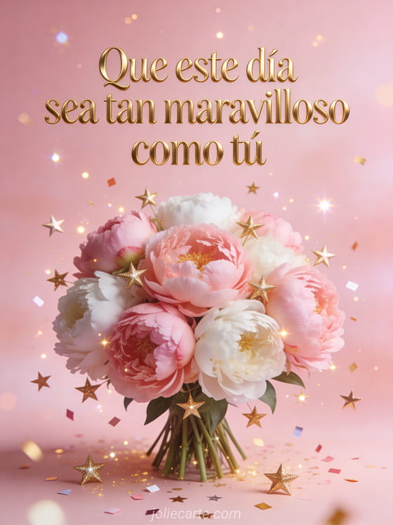 Celebra el cumpleaños de una amiga con esta alegre tarjeta con letras doradas elegantes, un suntuoso ramo de peonías rosas y blancas rodeado de estrellitas doradas y confeti centelleante sobre fondo rosa empolvado. Descubre también una tarjeta de amistad con lirios o una tarjeta de cumpleaños para mejor amiga.