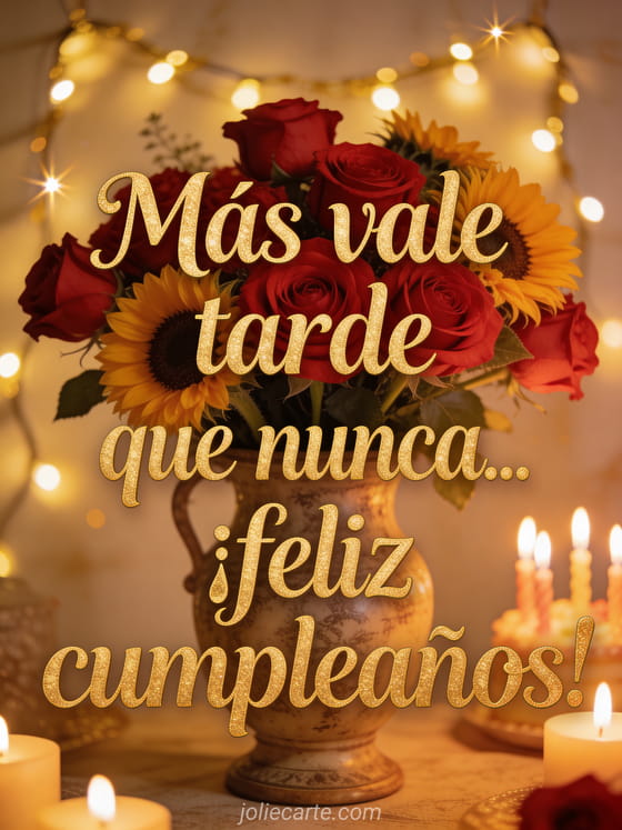 Más vale tarde que nunca. Envía cálidos deseos de cumpleaños con esta hermosa tarjeta con girasoles y velas. Descubre también una tarjeta de cumpleaños retrasado o una tarjeta de cumpleaños atrasado.