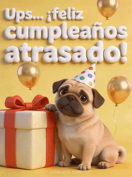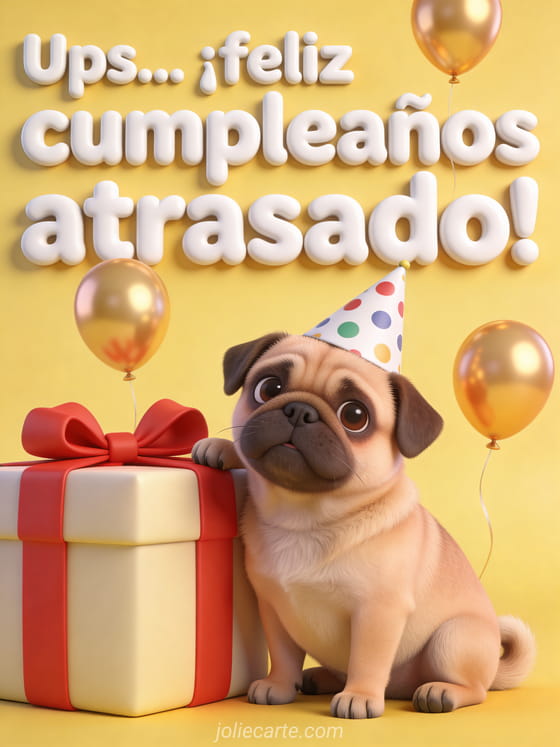 Ups! Envía esta linda tarjeta de cumpleaños atrasado con un adorable pug, globos y regalos. Descubre también una tarjeta festiva de cumpleaños atrasado o una tarjeta de cumpleaños atrasado divertida.
