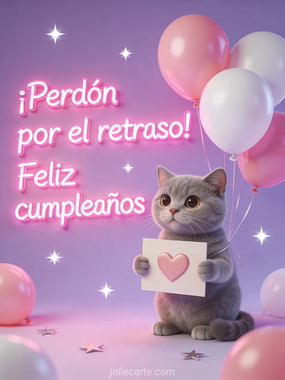 Pide perdón por el retraso con esta adorable tarjeta de cumpleaños con un lindo gato british shorthair, corazones y globos. Descubre también una tarjeta de cumpleaños atrasado con humor o una tarjeta de cumpleaños retrasado.