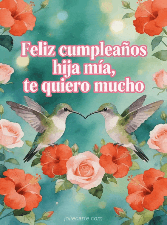 Envía un emotivo saludo de cumpleaños a tu hija con esta hermosa tarjeta acuarela con dos colibríes formando un corazón con sus picos entre flores de hibisco rosas y rojas. Descubre también una tarjeta de cumpleaños hija adorada o una mensaje de cumpleaños para mi hija.