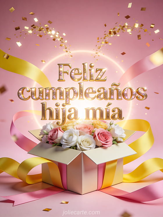 Envía un alegre feliz cumpleaños a tu hija con esta hermosa tarjeta con rosas, regalos y confeti. Descubre también una tarjeta de cumpleaños para hija adulta o un texto de cumpleaños para hija adulta.