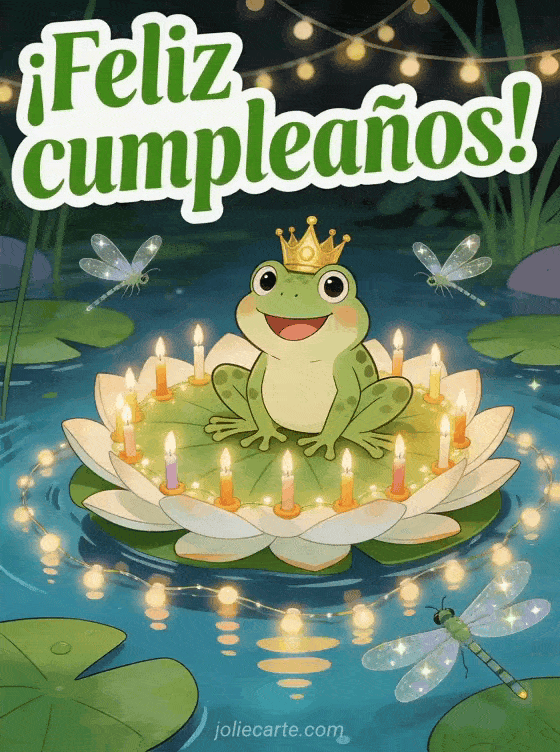 Sorprende a alguien con esta divertida tarjeta de cumpleaños con una rana graciosa con corona dorada sentada en un nenúfar gigante decorado con libélulas brillantes. Descubre también una tarjeta de cumpleaños para hija con amor o una tarjeta de cumpleaños hija adorada.