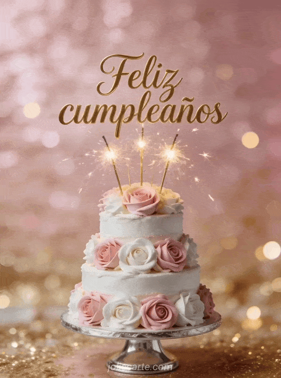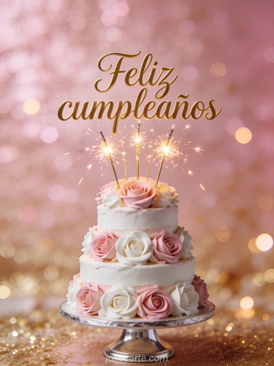 Celebra un cumpleaños especial con esta elegante tarjeta fotorrealista con un pastel de tres pisos decorado con rosas de crema rosa y blanca y bengalas doradas sobre un fondo brillante. Descubre también una tarjeta de cumpleaños para hija con gato o una tarjeta divertida de cumpleaños para hija.