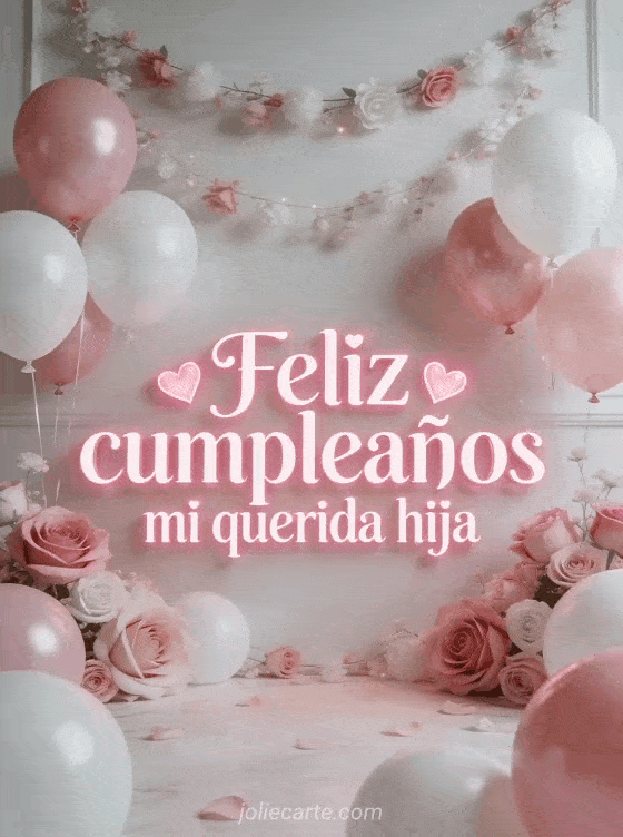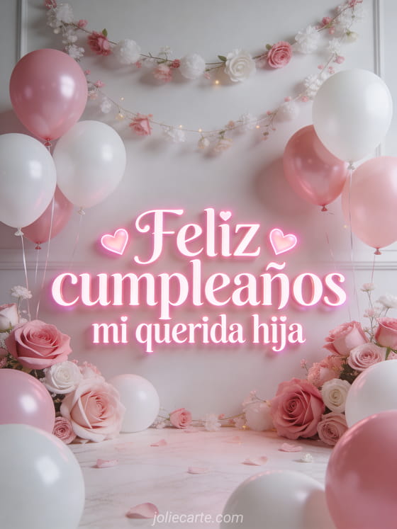 Celebra el cumpleaños de tu hija con esta hermosa tarjeta de felicitación gratuita. Letras rosas luminosas con efecto de corazones, globos rosas y blancos y guirnaldas en un ambiente alegre. Descubre también una tarjeta de feliz cumpleaños para hija o una tarjeta de cumpleaños con hadas.