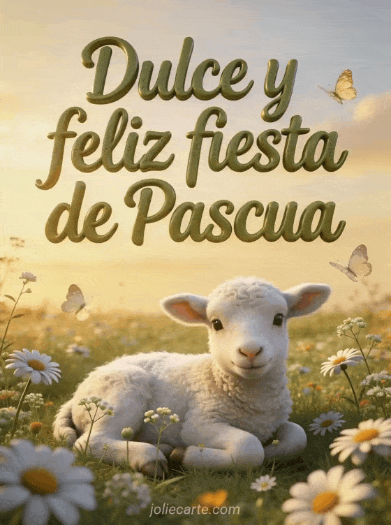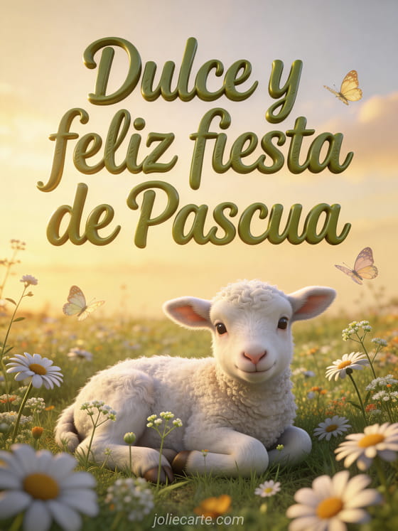 Comparte este dulce saludo de Pascua con un corderito blanco acostado en un prado de margaritas con mariposas delicadas. Una tierna ilustracion 3D banada en luz suave de tarde. Descubre tambien una tarjeta de mensaje de Pascua o una tarjeta de felices Pascuas.