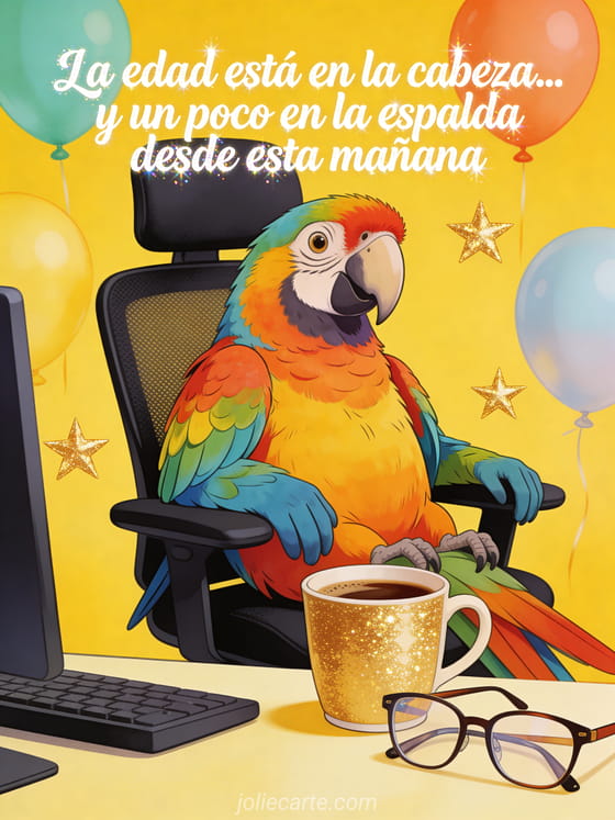 Envía esta hilarante tarjeta de cumpleaños con un loro colorido sentado en un sillón de oficina con taza de café y gafas de lectura. Descubre también una tarjeta divertida cumpleaños nutria o una tarjeta glamurosa cumpleaños gato.