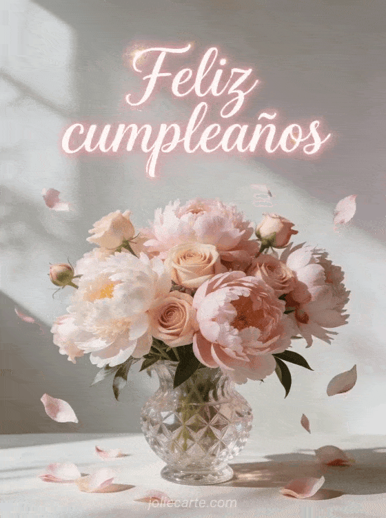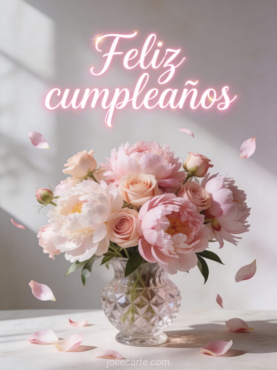 Envia esta encantadora tarjeta de feliz cumpleaños con un magnifico ramo de peonias y rosas en un jarron de cristal, con petalos que caen suavemente, bañado en una luz natural delicada. Descubre tambien una tarjeta animada de cumpleaños con fuegos artificiales o una tarjeta animada de cumpleaños.